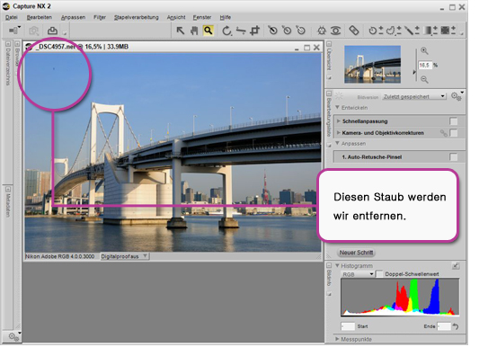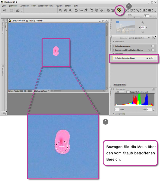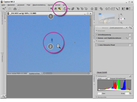 Klicken Sie auf den zu entfernenden Staub, um diesen Bereich zur einfacheren Bearbeitung zu vergrößern.