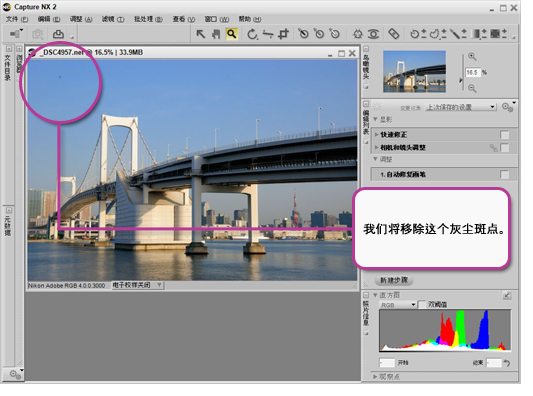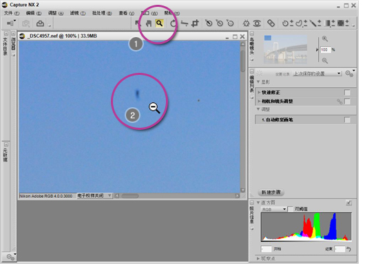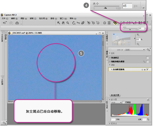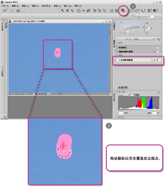 使用 Capture NX 2 中的自动修复画笔,可以轻松除去影像中的灰尘斑点或异物。