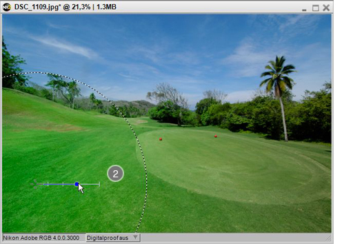 - Der zweite Farbkontrollpunkt beeinflusst nicht nur die Farbe der Rasenfläche, sondern auch die Farbe der im Hintergrund stehenden Bäume.