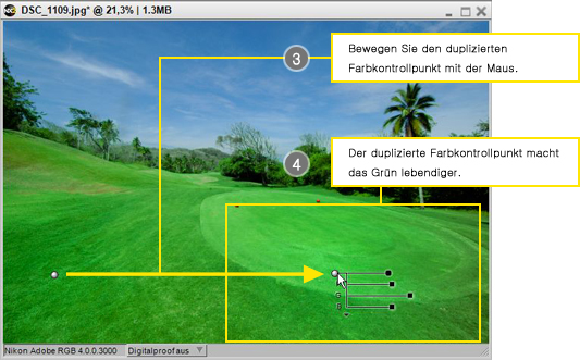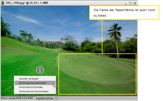 - Duplizieren Sie den Farbkontrollpunkt, um auch das blasse Grün auf der rechten Seite des Bilds (um das Loch herum) zu verbessern. Bewegen Sie den Mauszeiger über den Farbkontrollpunkt und klicken Sie rechts (Mac OS: Drücken Sie die CONTROL-Taste und klicken Sie). Wählen Sie »Farbkontrollpunkt duplizieren« aus dem Menü.