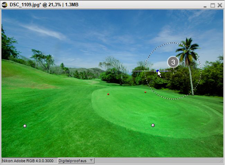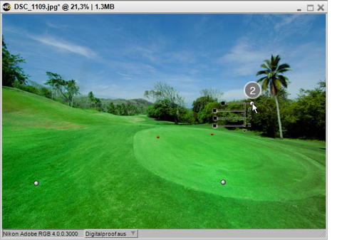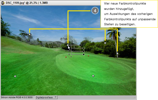 - Sie können beliebig viele Farbkontrollpunkte auf dem Hintergrund platzieren um die Bereiche zu bestimmen, die von Anpassungen der vorherigen Farbkontrollpunkte nicht beeinflusst werden sollen. Im Beispiel wurden drei weitere Farbkontrollpunkte (insgesamt also 4 Farbkontrollpunkte) auf dem Hintergrund platziert.