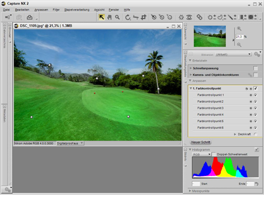 Das untenstehende Bild zeigt das Ergebnis der Bearbeitung. Für jeden im Bild verwendeten Farbkontrollpunkt wird der Bearbeitungsliste ein Schritt hinzugefügt.
