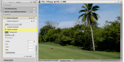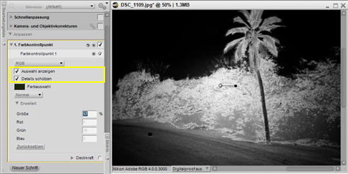 Farbkontrollpunkte beeinflussen in ihrem Wirkungsbereich alle Farben, die derjenigen ähnlich sind über der der Punkt platziert wurde. Aus diesem Grund werden manchmal auch Bildbereiche beeinflusst, die von der Bearbeitung nicht betroffen sein sollten. Um dies zu verhindern können Farbkontrollpunkte mit ihren Standardeinstellungen über Bildbereiche platziert werden, die nicht verändert werden sollen. Außerdem lassen sich durch aktivieren (ankreuzen) der Option