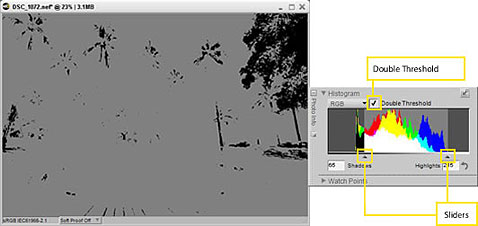 The following step requires locating the darkest and lightest portions of an image. If locating these points is difficult with normal image display, the double-threshold effect displays the image as a monochrome illustration, making it easy to locate the darkest (shown in black) and lightest (shown in white) portions of the image.