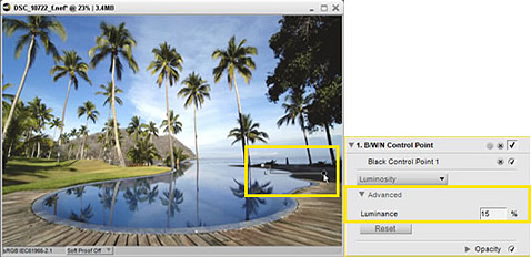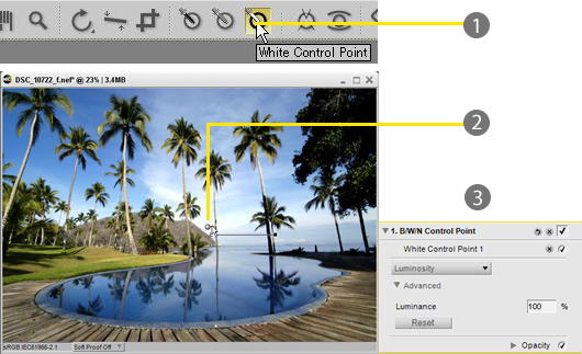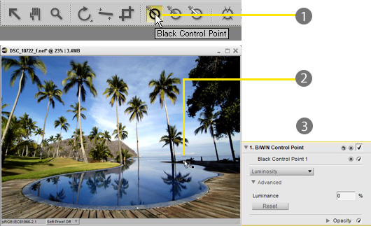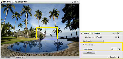 When Black or White Control Points are placed over an image, those points become true black (0 at the default luminance setting) and true white (100 at the default luminance setting), respectively. Therefore, the brightness of the resulting image will vary dramatically depending upon where Control Points are placed.